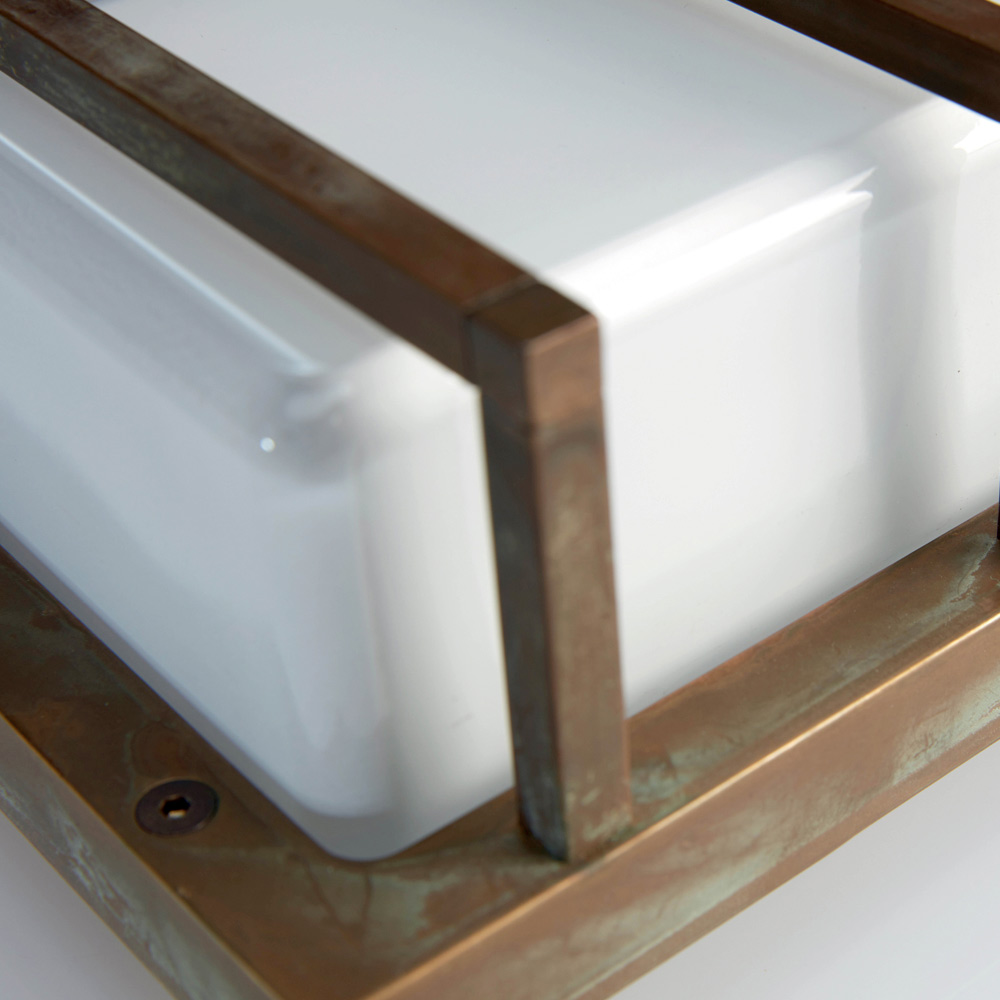 Simple and elegant, this handcrafted wall light is a refined lighting solution, designed to enhance modern walls and contemporary spaces. The die-cast brass structure, combined with a rectangular opal glass diffuser , creates a soft, even light, ideal for welcoming and functional lighting.