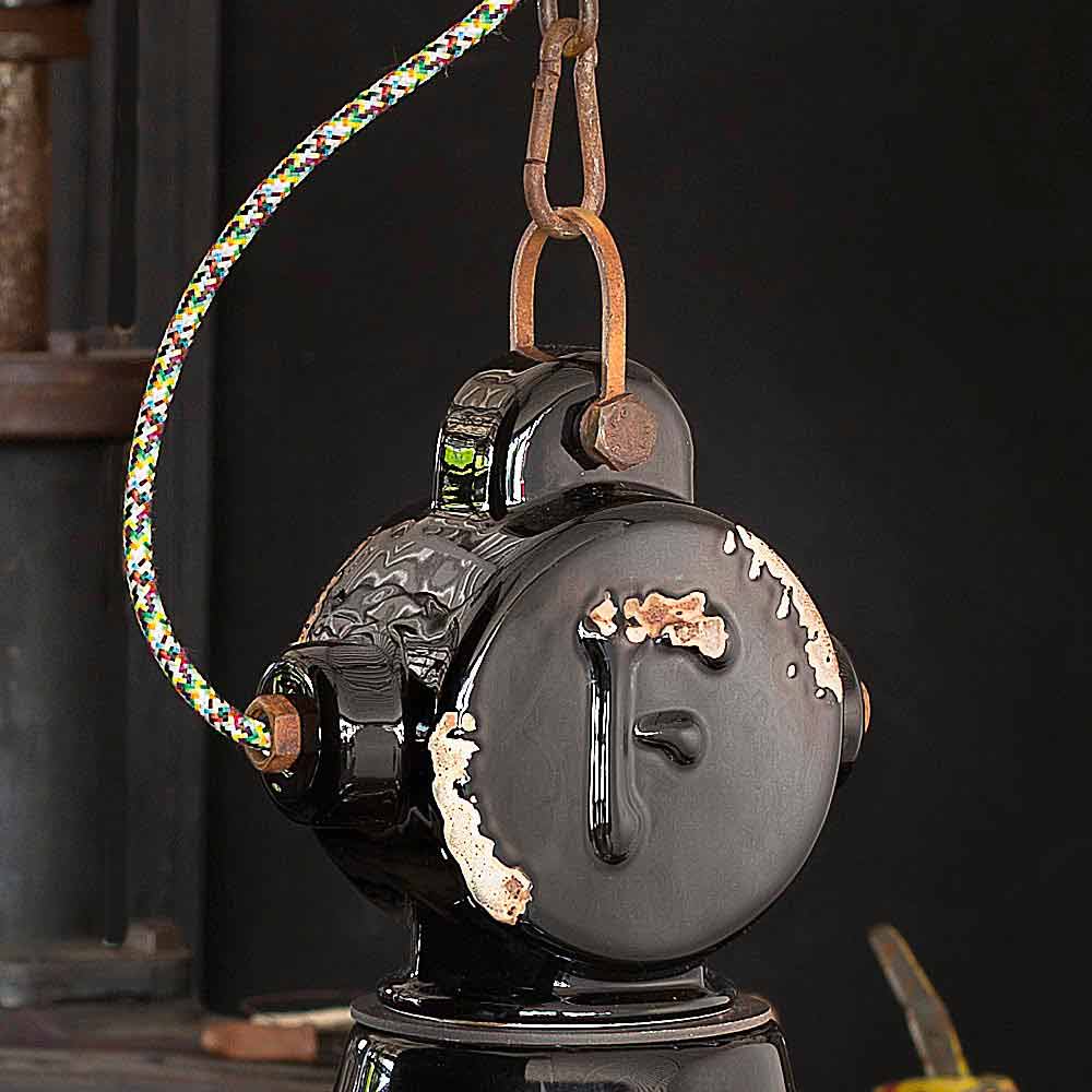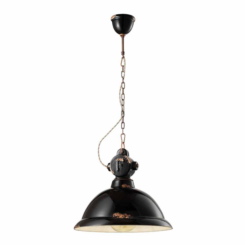 The peculiarity of this lamp lies in the craftsmanship of the ceramic diffuser. The ceramic, in fact, is decorated in such a way as if time had marked its path. The reproduction of the erosion of time combined with the shiny surfaces give that extra value to this suspension. This time-worn effect gives Angela a sophisticated vintage-industrial style. The metal structure amplifies even more the antique effect.
