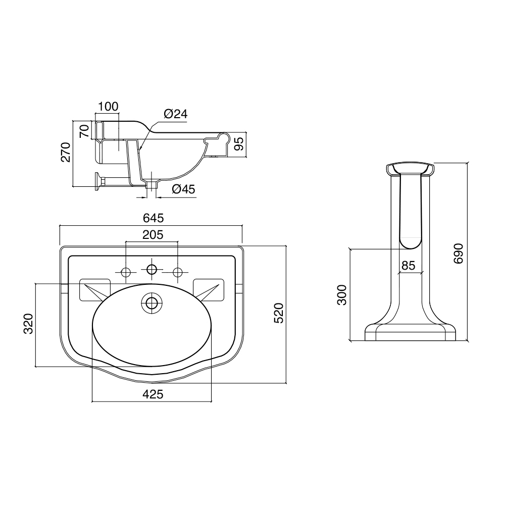 • L 64.5 x W 52 x H 69 cm with splashback and splash guard border 1-3 faucet holes - L 645 mm;
