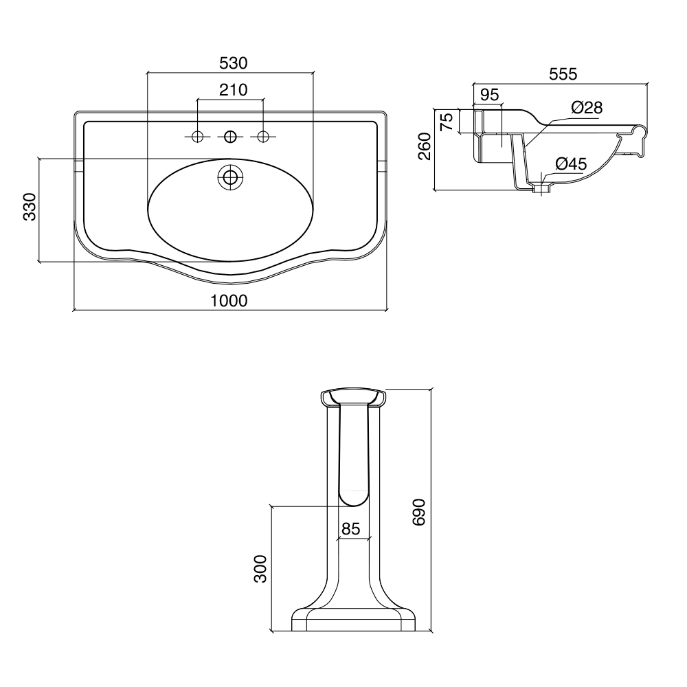 • L 100 x D 55.5 x H 69 cm with splashback and splashback edge 1-3 faucet holes - L 1000 mm;