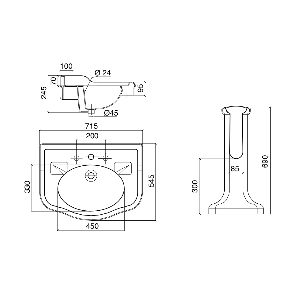 • W 71.5 x D 54.5 x H 69 cm with splashback and splash guard border 1-3 faucet holes - L 715 mm;