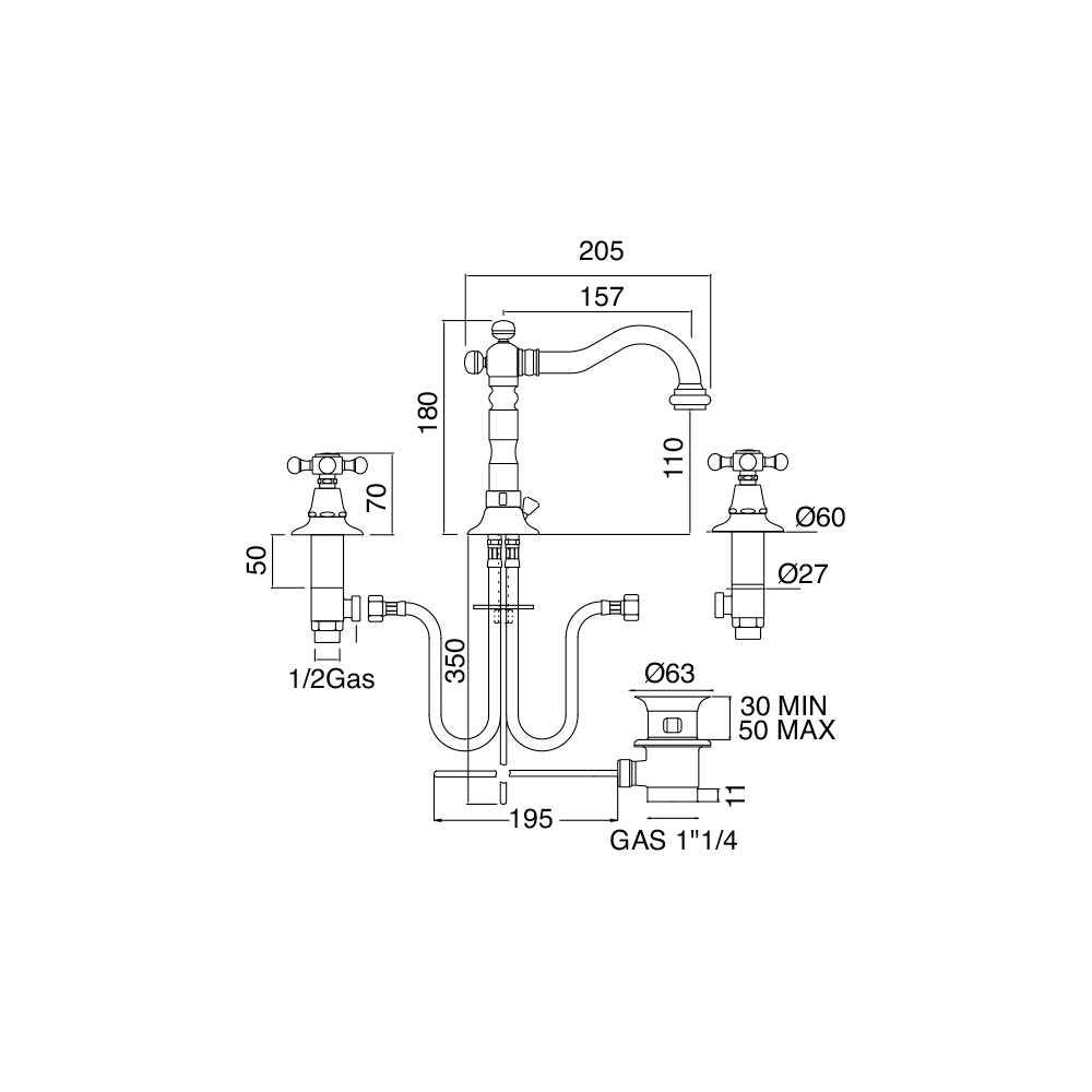 3-hole washbasin faucetĀ with drain, made of brass.