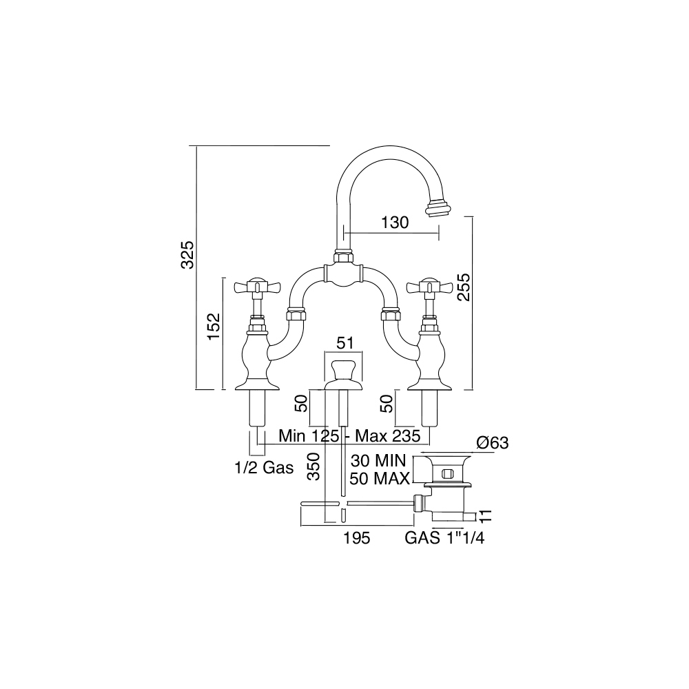 bridge group for washbasinĀ 2-3 holes with drain, adjustable center distance and jointed spout.