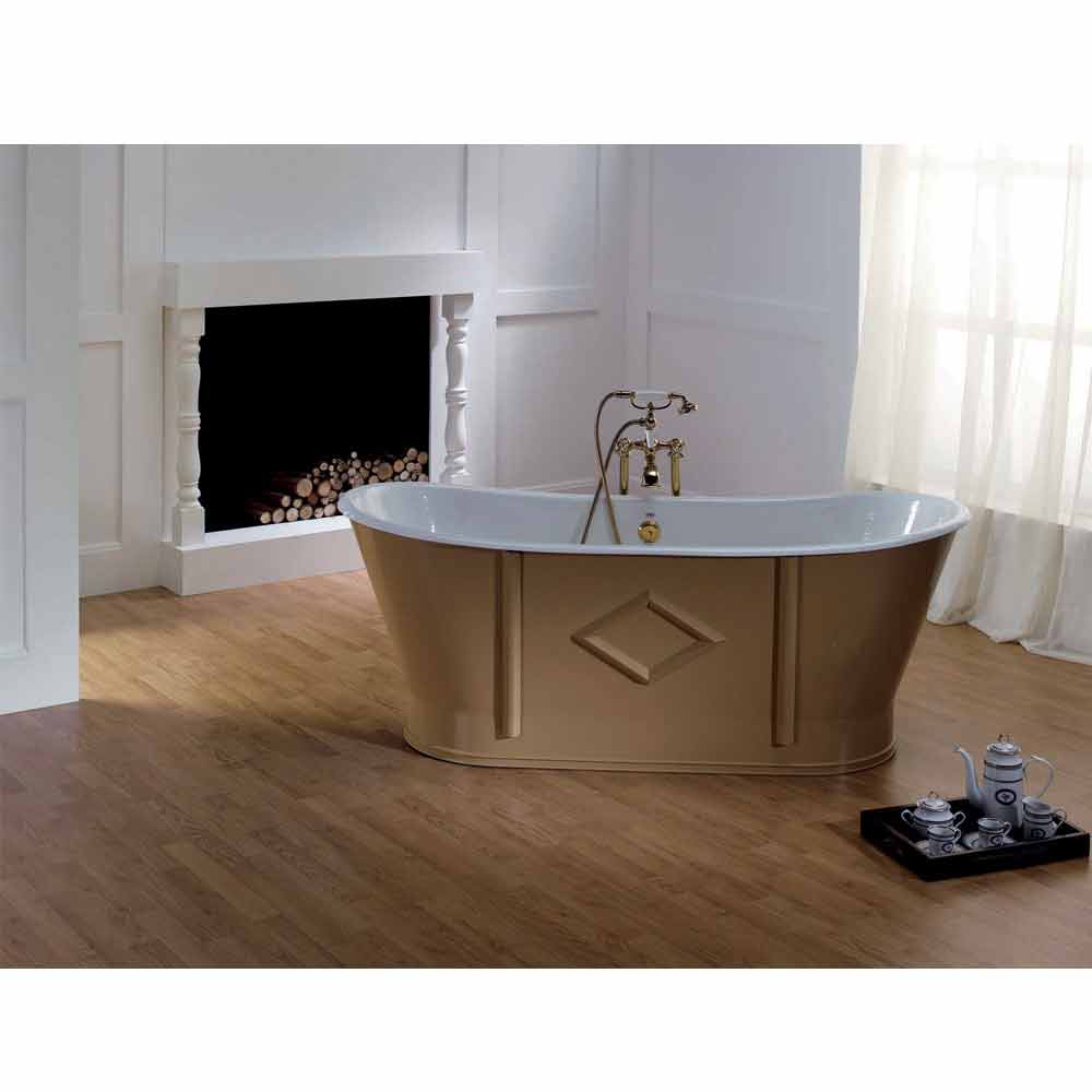 Freestanding bathtub entirely made of cast iron resting on the ground, with decoration on the side. Internal 2 mm titanium enamelled finish and external painted finish in different colors. Bathtub that represents the top of luxury!