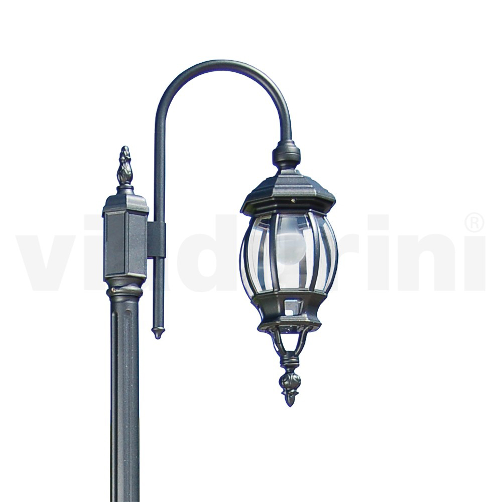 Garden lamp with structure made of die-cast aluminum with anthracite gray finish and transparent polycarbonate diffuser. Complete with stainless steel screws. A product that comes from a 100% Made in Italy production , characterized by a refined design and a vintage and romantic soul made unique by the wonderful details and the refined and refined decorations. Ideal for outdoor spaces such as gardens, avenues and walkways but also contract environments such as bars and restaurants.