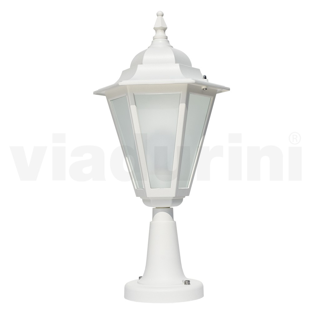 Outdoor floor lamp entirely made in Italy with die-cast aluminum structure in embossed white finish and glass diffuser. Complete with stainless steel screws. A product marked by a vintage style that enriches its aesthetics thanks to the wonderful and accurate details that make each element of the lamp refined and exclusive. Ideal for outdoor spaces such as avenues, porches and walkways but also domestic spaces such as gardens and contract environments such as bars and restaurants.