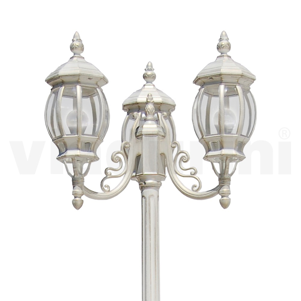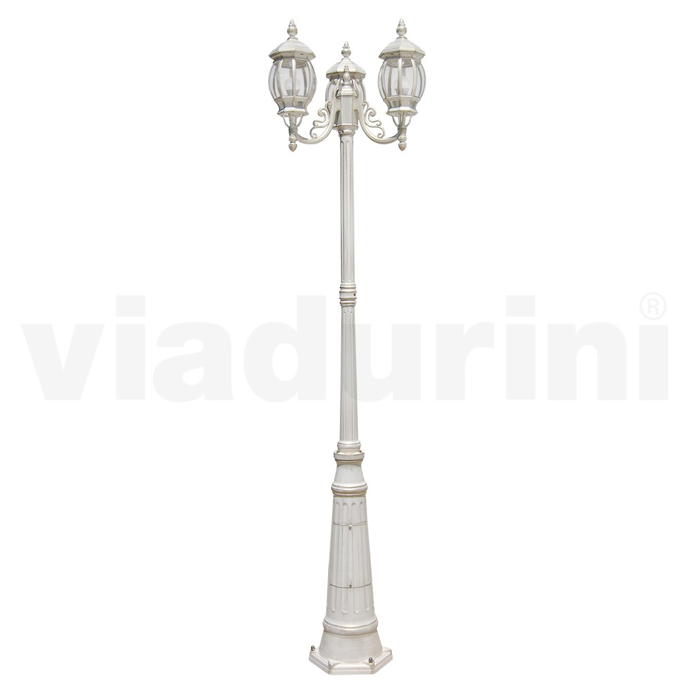 3-light street lamp in die-cast aluminum with transparent polycarbonate diffuser made through 100% Made in Italy production . Complete with stainless steel screws. A vintage and romantic style that goes perfectly with the wonderful finishes offered, creating an elegant result with a strong personality enriched and made unique by the wonderful details that characterize the entire structure. Ideal for outdoor environments such as gardens, avenues, walkways or outdoor contract spaces such as bars and restaurants.