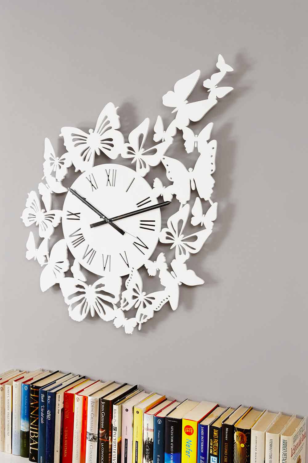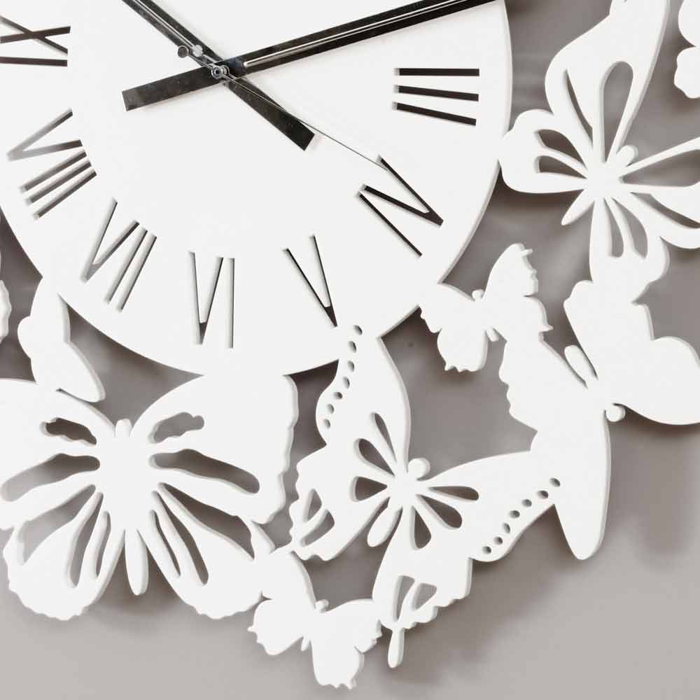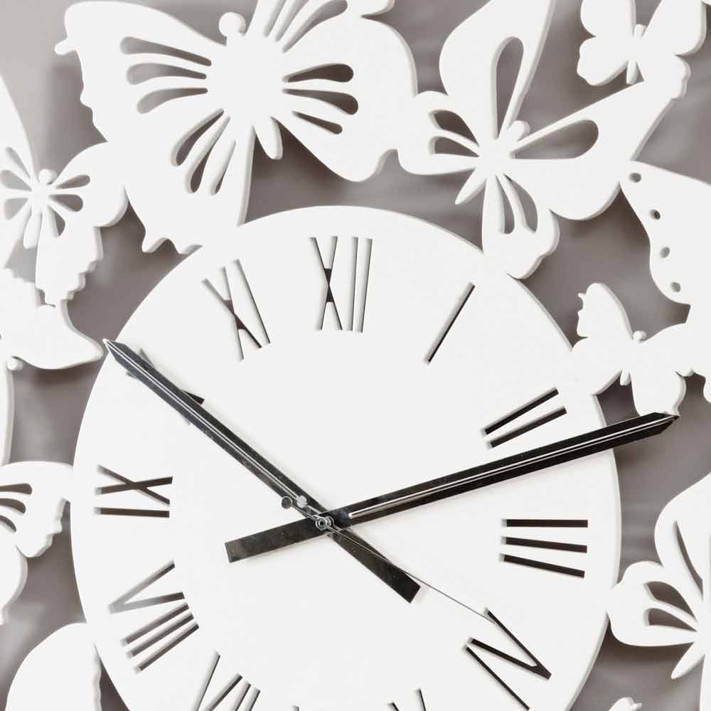 Large wall clock in white, black, taupe, beige or brown wood, round design with butterflies made in Italy.