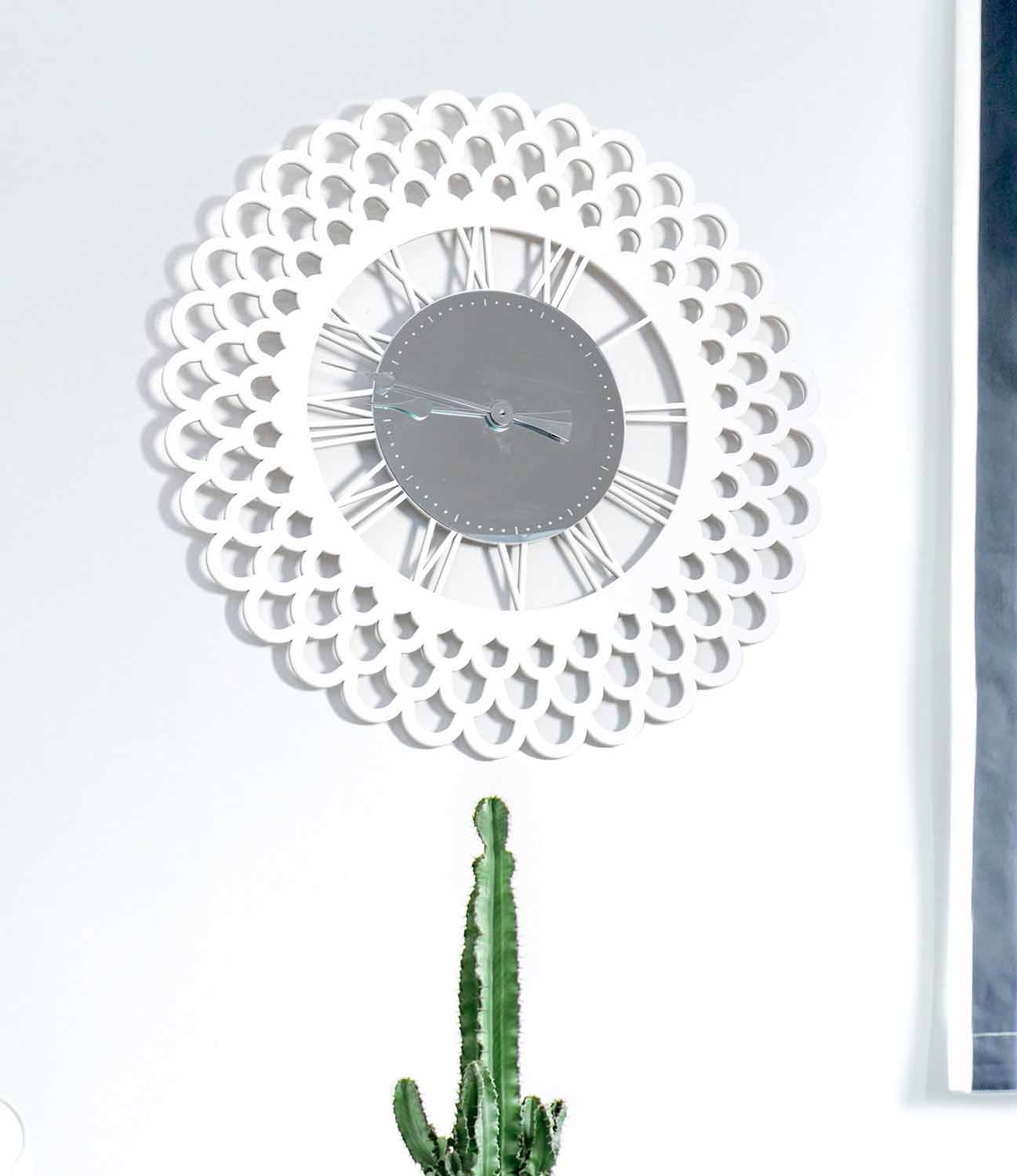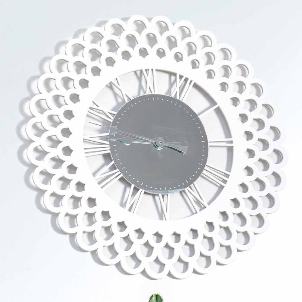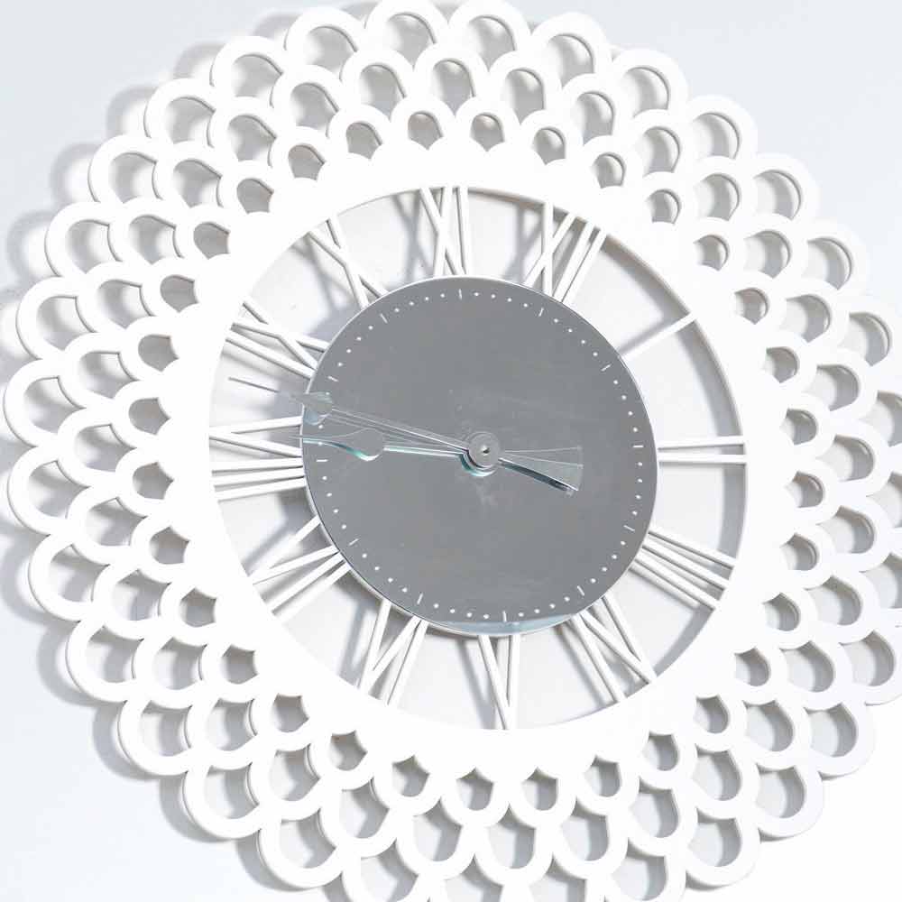 Large wall clock, modern white wood design with mirror decoration, floral shape made in Italy.