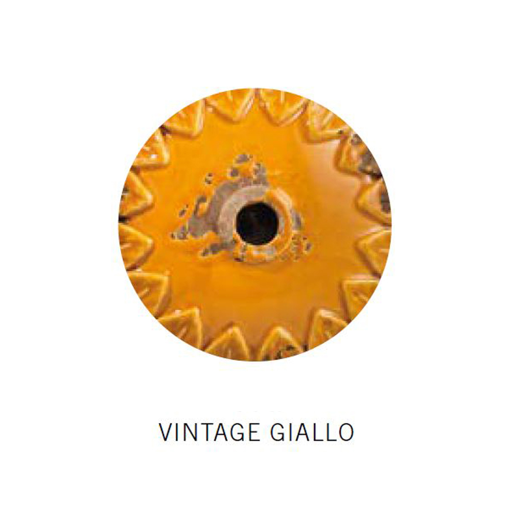 The glossy glass diffuses great brightness throughout the room, while the corten-effect metal obtained by means of natural oxidation combined with the colors of the ceramic enhances the characteristic bulb bulbs.