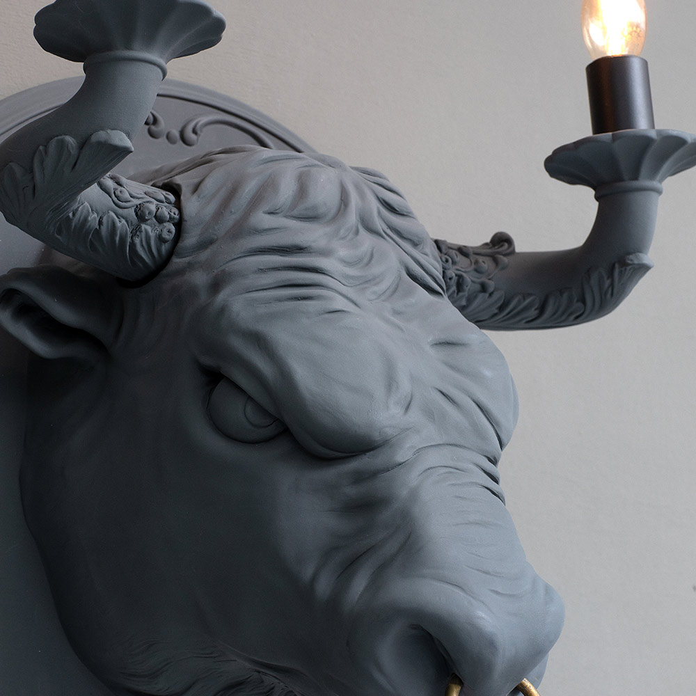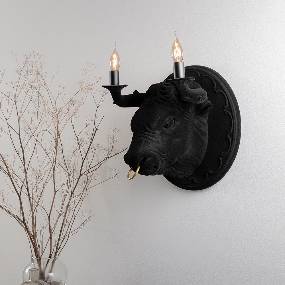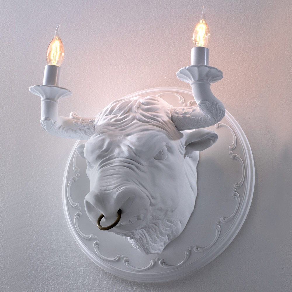 This original and unique wall light has a modern and cute design in the shape of a bull 's head complete with a nose ring and horns for lights, for a light and sophisticated spirit.