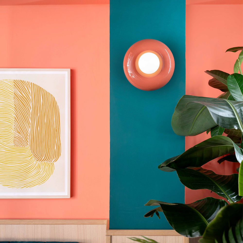 Wall light made of colored ceramic and milky white glass, entirely Made in Italy.