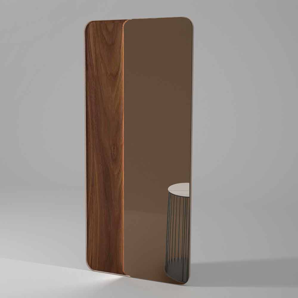 Wall mirror entirely made in Italy consisting of an outer ring in metal and a side insert in ceramic or wood completed by a mirror overlaid in bronze or silver finish. A