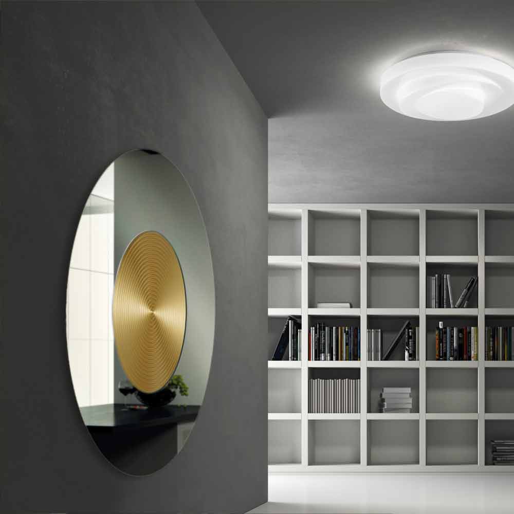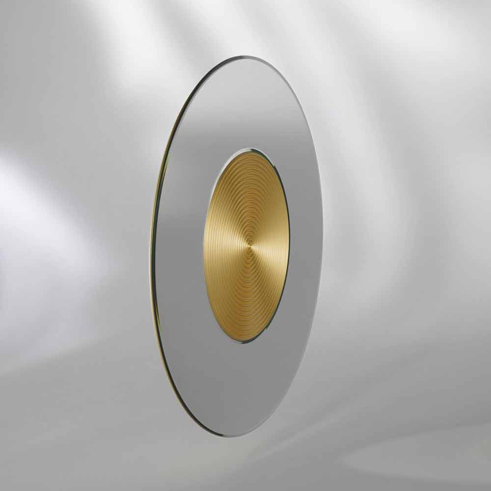 Designer mirror with a lacquered MDF support which is available with satinized white, satinized black or gold finish.