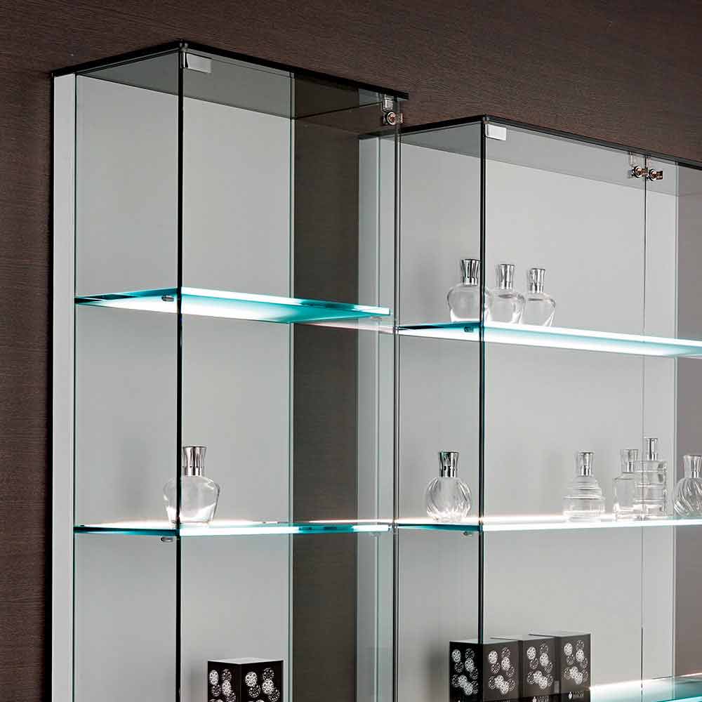 The two-door display cabinet with wheels to facilitate movement is made of transparent tempered glass and a structure in matt white lacquered wood.