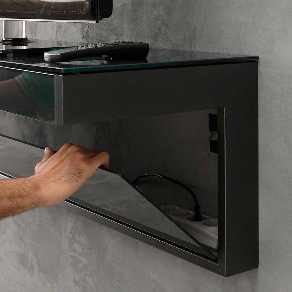 Exclusive suspended TV cabinet (wall mounting) made in Italy with glossy black glass top with cable hole, matt black painted metal structure and removable vertical plexiglass panel. It is also complete with a removable front drawer positioned under the top.