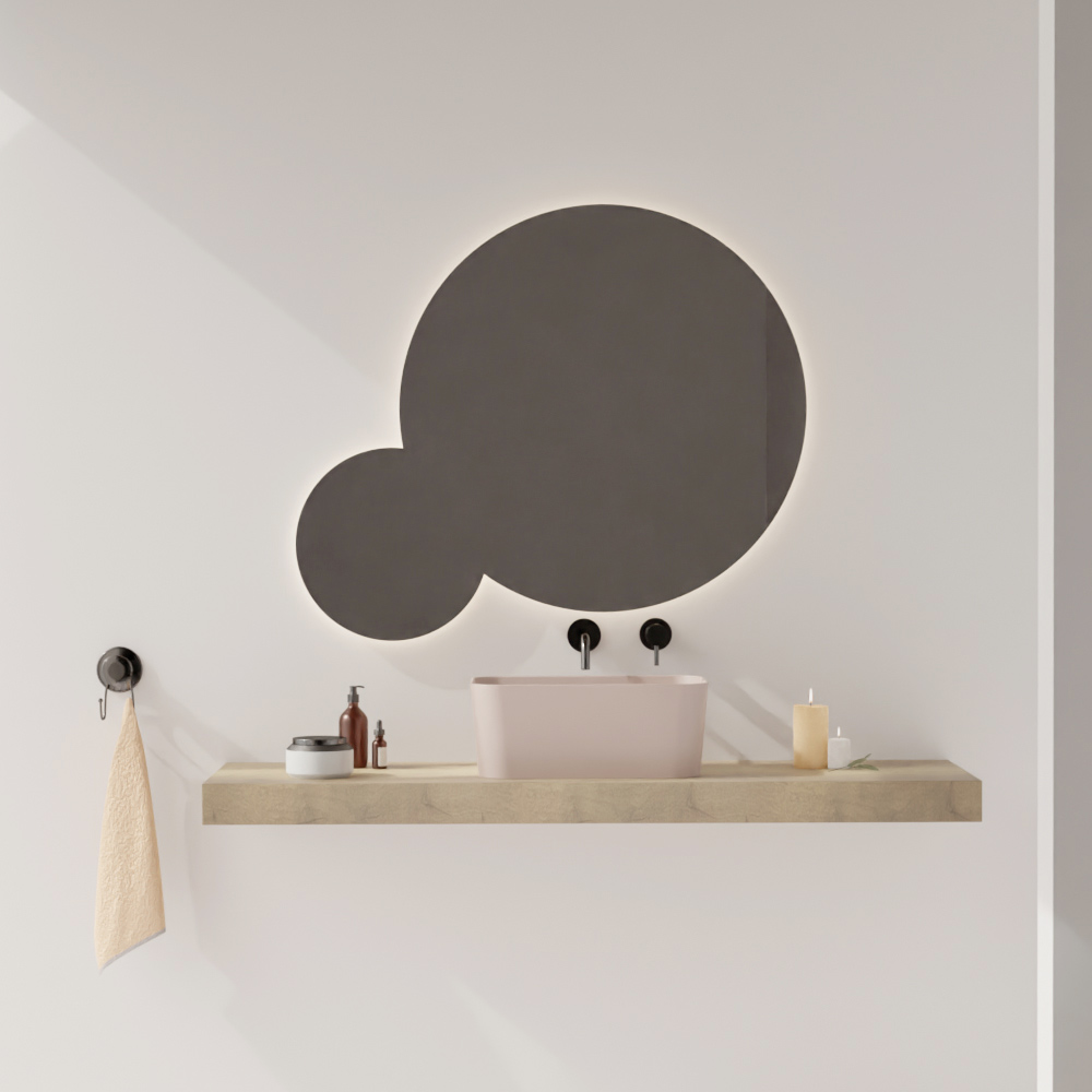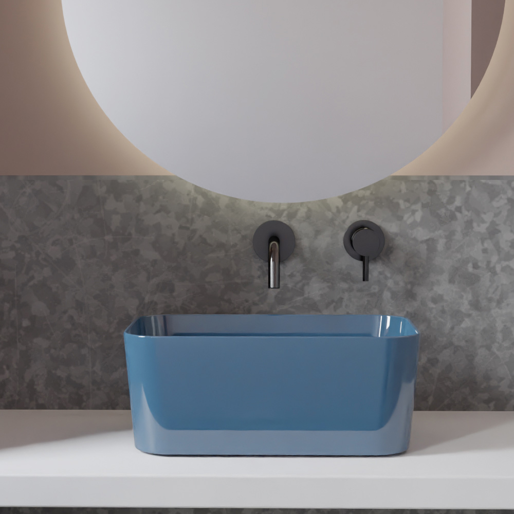 This ceramic countertop washbasin stands out for its geometric and clean design , a rectangular shape with rounded edges that adds a touch of modernity to every bathroom . The available shades are both refined and relaxing, evoking the tranquility of natural and minimalist environments.