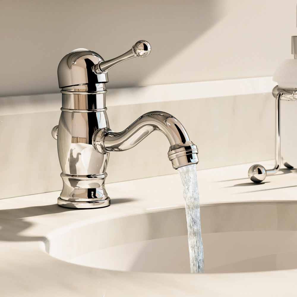 Classic design countertop basin mixer in chrome finish brass ; 150 mm high and with a wheelbase of 130 mm, with drain and pop-up mechanism.