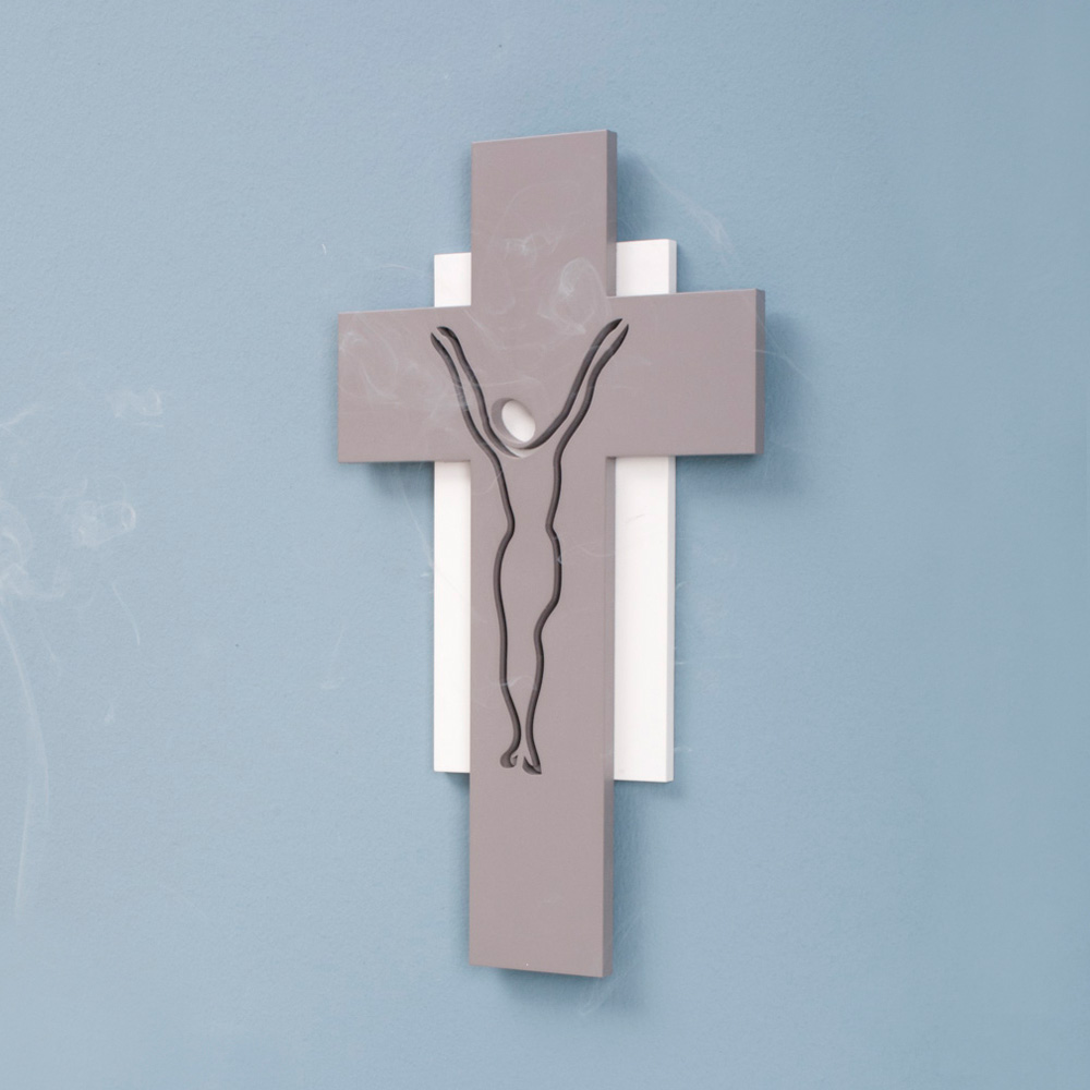 Gray lacquered wood crucifix with laser cut silhouette of Christ Crucified in contrast with white lacquered wood rectangle .