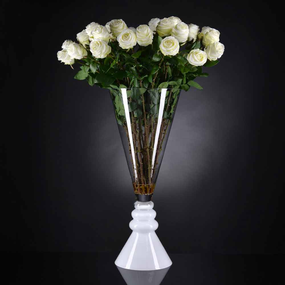 Indoor vase in transparent glass with white base made with a 100% Made in Italy processing . A complement characterized by a simple and clean aesthetic underlined by extreme elegance and versatile finishes that allow it to be used in any environment with a refined style . An ideal design for the most varied environments, from home furnishings to that of hotels, restaurants, contract areas, spas but also as a setting for events and weddings.
