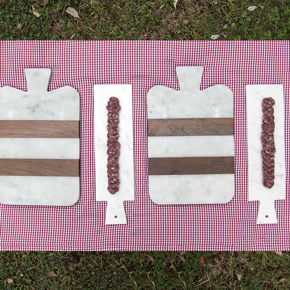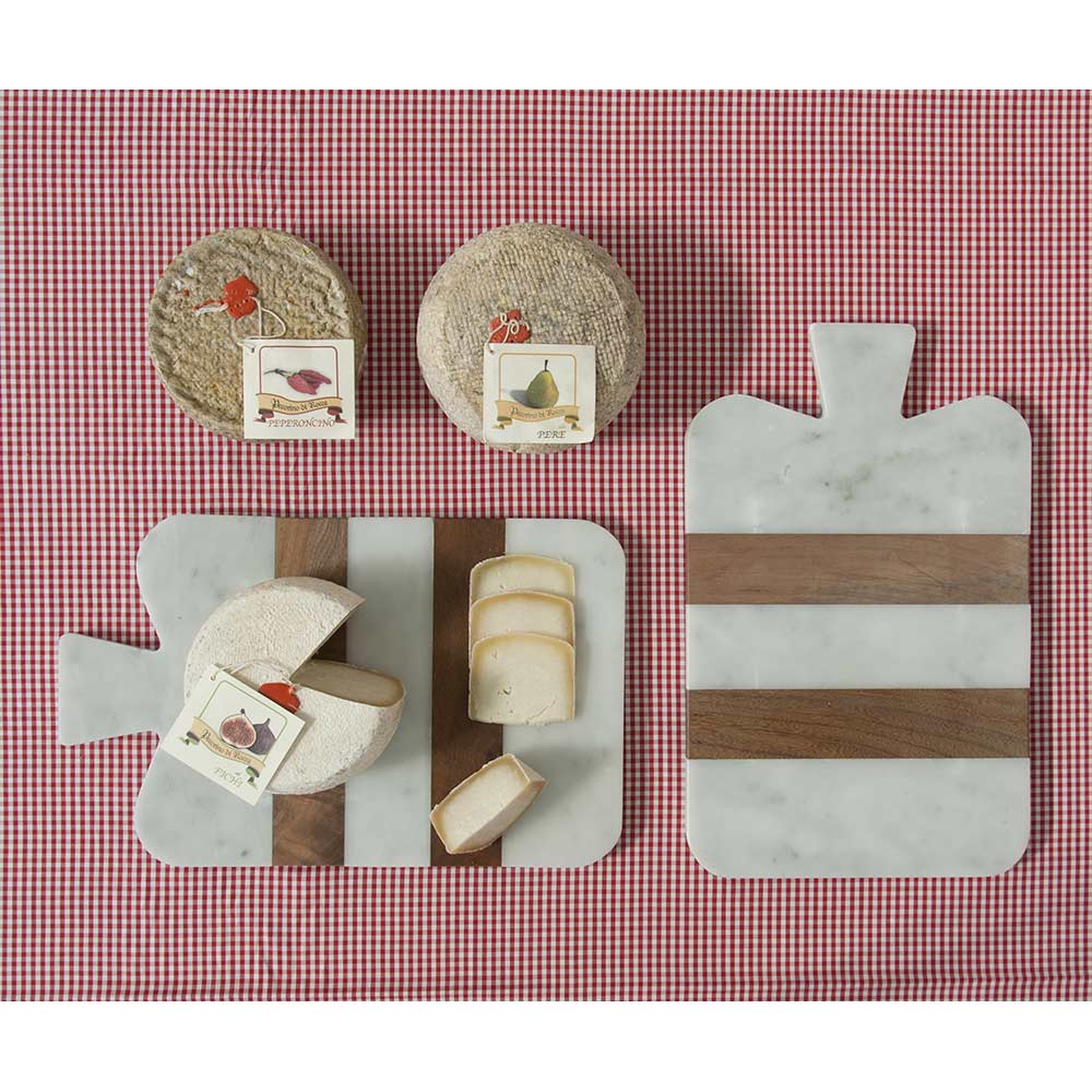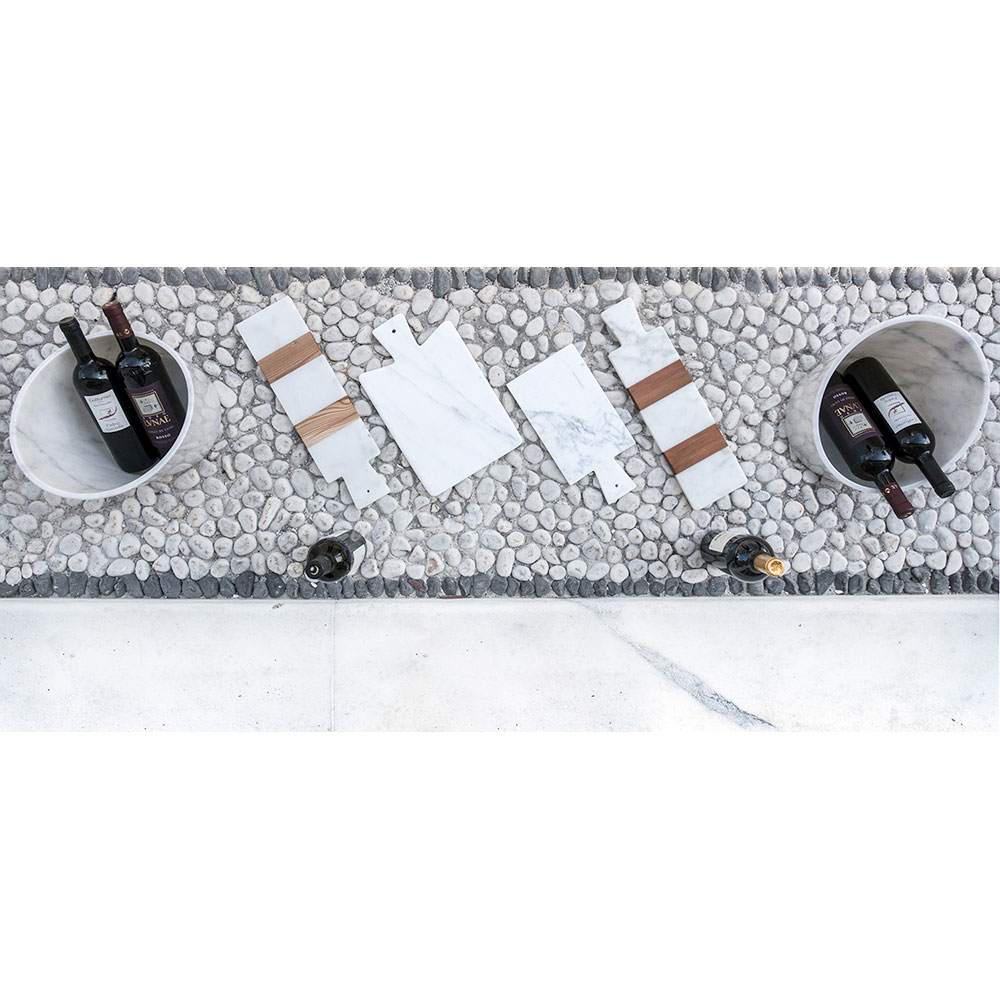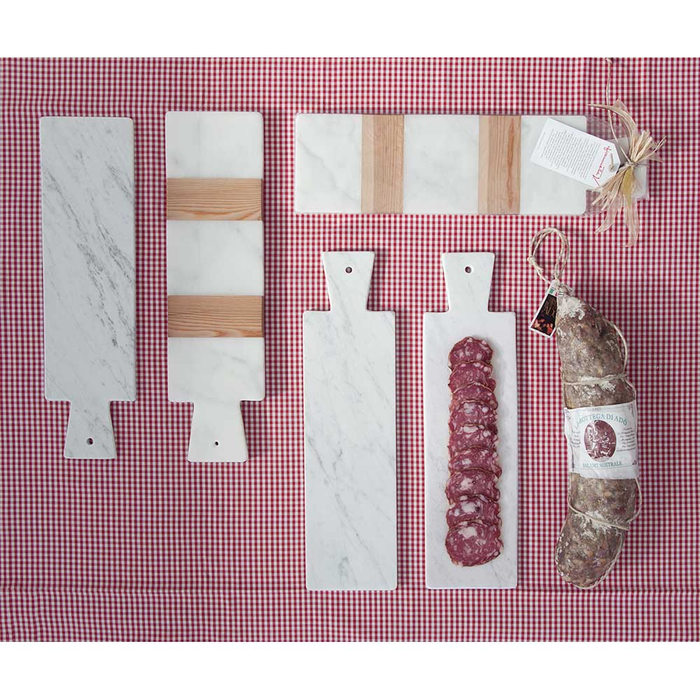 Rectangular cutting board available in 2 sizes characterized by high quality white Carrara marble used for its realization and by the wooden inserts . It also includes a practical hole on the handle for hanging.