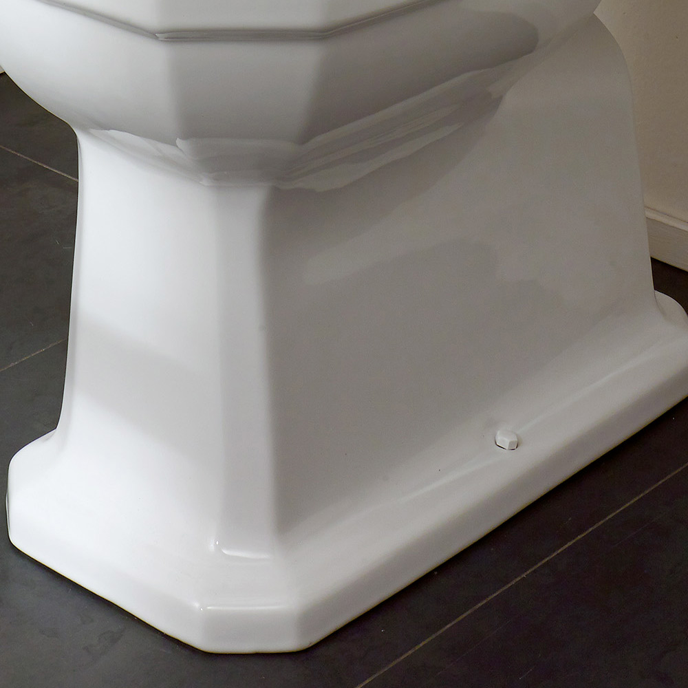 This toilet is a dripping rim model with a floor drain, equipped with a monobloc box with cover and drain battery with button. This is an article entirely made in Italy in ceramics.