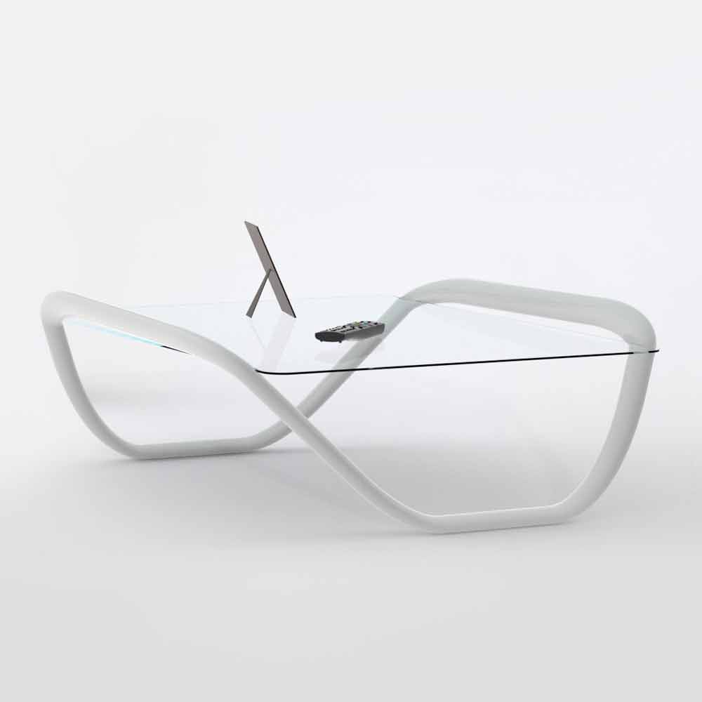 Coffee table made with Solid Surface structure; for a proposal characterized by the simple and suggestive sign of a sinuous continuous line. An essential formal solution, able to personalize the environment. The transparency of the glass top allows to emphasize the soft lines of the structure. A unique shape in the continuity of space. Featuring a glossy / matte white lacquer finish (RAL9003).
