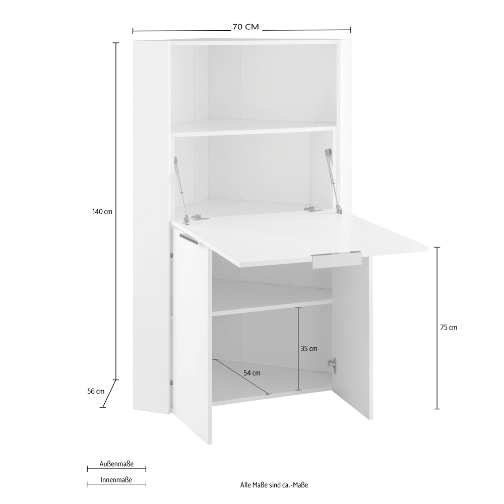 The structure consists of two lower hinged doors and an upper flap door which also acts as a desk top when opened downwards through the practical use of a handle.