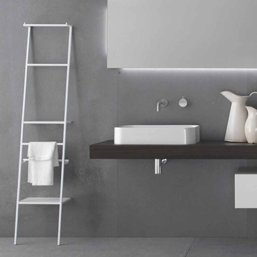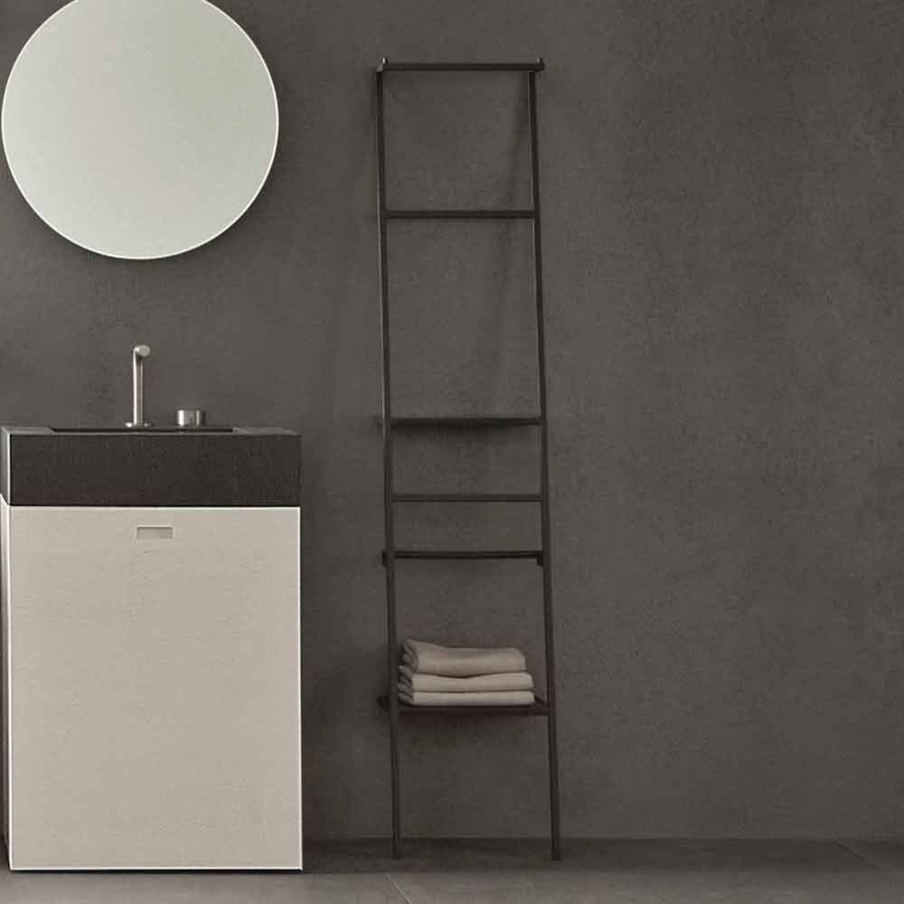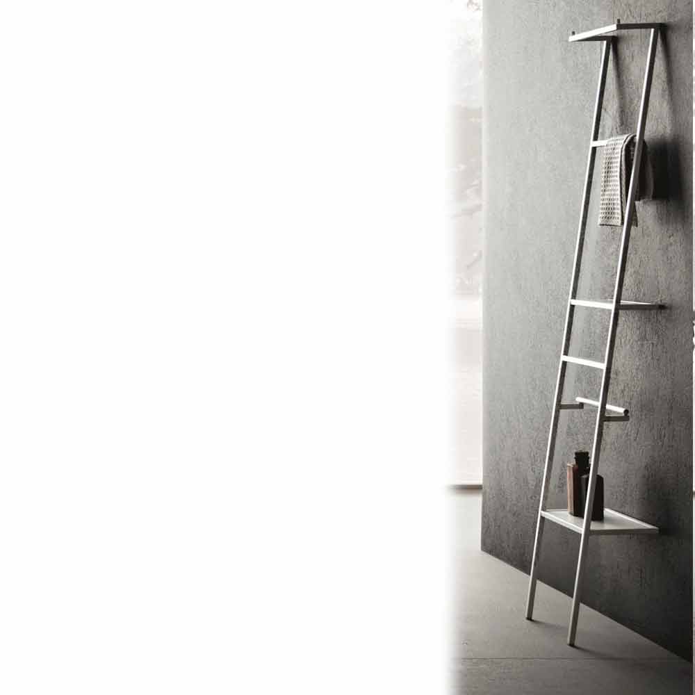 Hanging ladder in matt painted metal with a minimal and extremely functional design. It is equipped with shelves, hooks for bathrobes, roll bars and towel rails.
