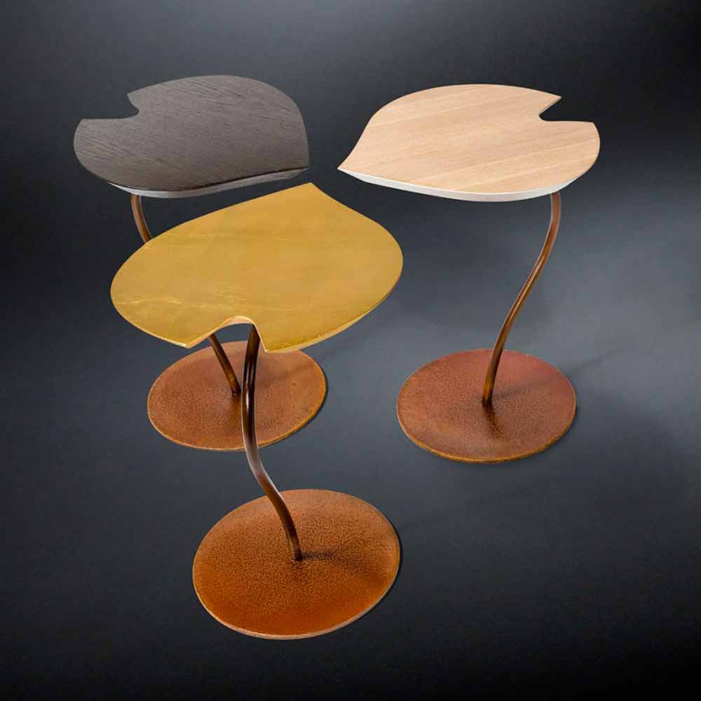 Elegant coffee table with a unique design. The top is made of MDF, with three different veneers available: whitened opern pore natural oak, or open pore brushed oak painted in the colours wenge-moka or with golden leaf decorations. The modern design table Leaf will look good in any room.