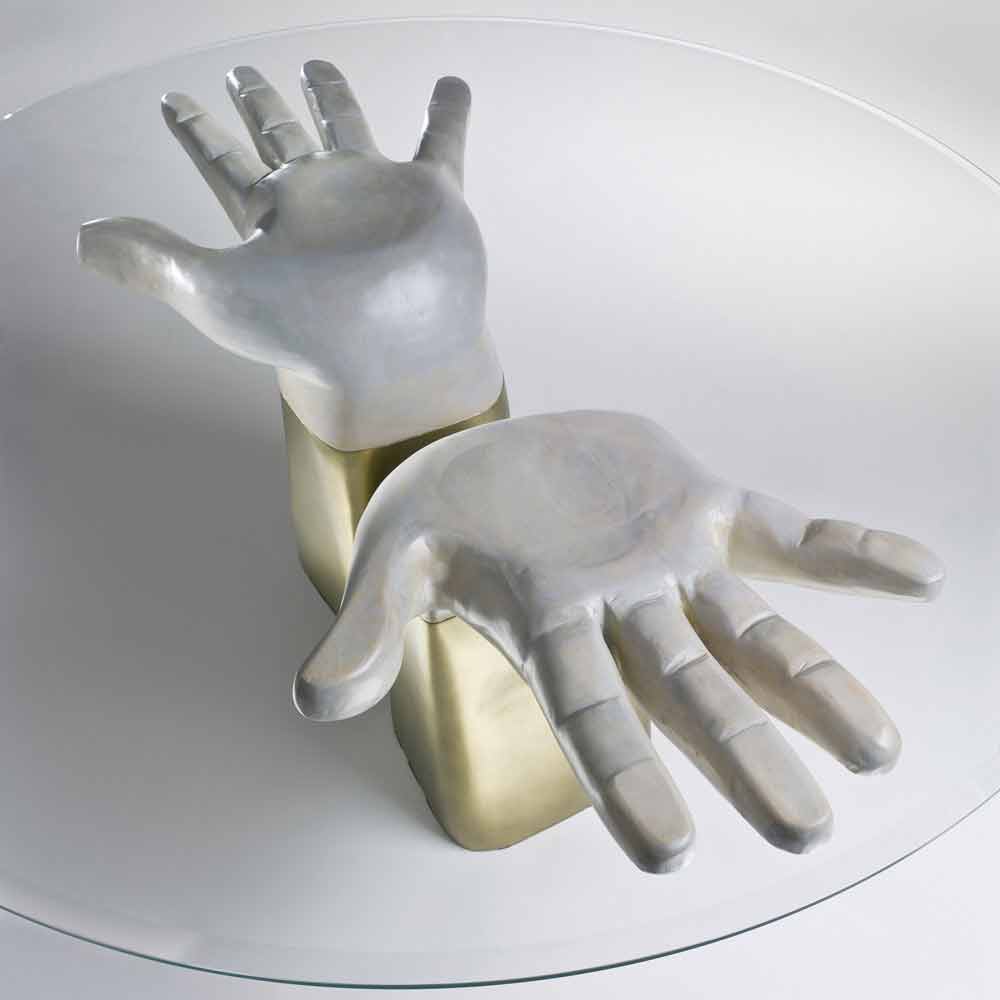 Structure and ornament enhance each other: the round top is in fact supported by the palms of two hands, huge hand-carved wooden limbs with golden cuffs that recall pop suggestions. The top is made of bevelled glass.