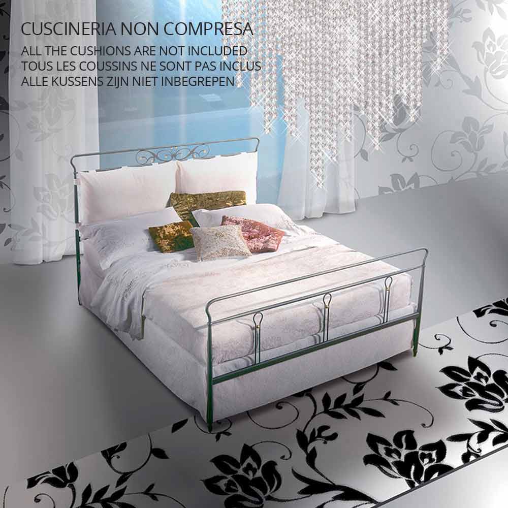 The wrought iron bed in the DOUBLE HEADBOARD WITH FOOTBOARD AND CONTAINER variant includes a slatted base that can accommodate a 160 x 190 cm mattress. The base we supply has a special mattress retaining system that allows it to also accommodate a 190 cm long mattress. In case there are particular aesthetic needs, this model, thanks to our artisan productivity, can be modified in height. The container is made entirely of metal and can be painted in any color. Having a metal container guarantees countless advantages to our bed including solidity, ease of cleaning and greater capacity. The container can in any case be combined with a textile valance. This version with footboard for example can only be made thanks to the metal structure of the container, a very welcome combination because it allows you to combine the classicism of a complete bed with the convenience of using the storage space.