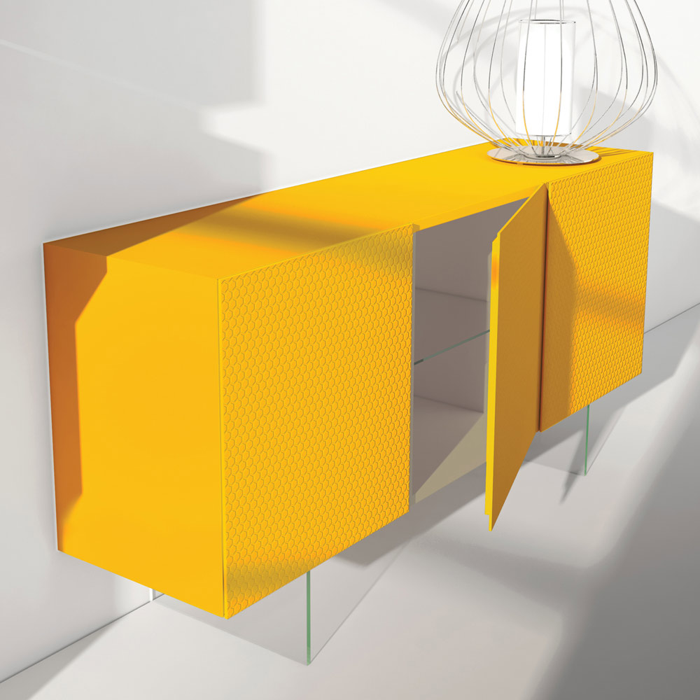 Living room sideboard with canary yellow matt lacquered MDF structure also including extra-clear glass feet . The opening system has 3 hinged doors to ensure perfect functionality and practicality . This product is marked by taste and design thanks to the union of various materials, its elegant and refined finishes and embellished by the decoration on the door made up of many small HPL honeycomb-shaped tiles . All the materials used for the construction offer great quality and resistance over time, giving the product that unique and unforgettable touch.